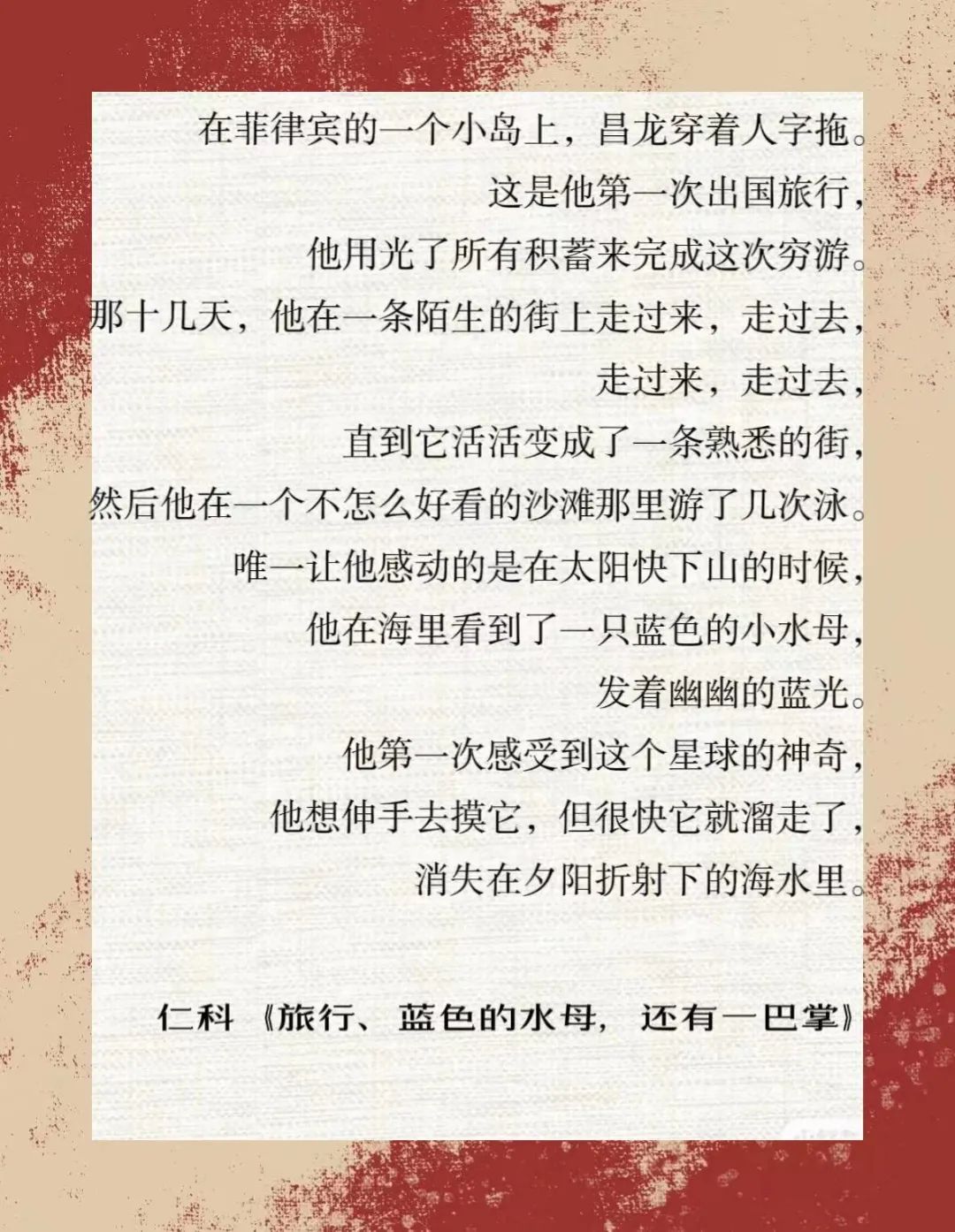 仁科:第一次写小说,其实我在作品里面有间接提到过。在《旅行、蓝色的水母,还有一巴掌》里面,这篇是后来写的,但这篇小说里面提到写了一篇作文叫《游泳》。