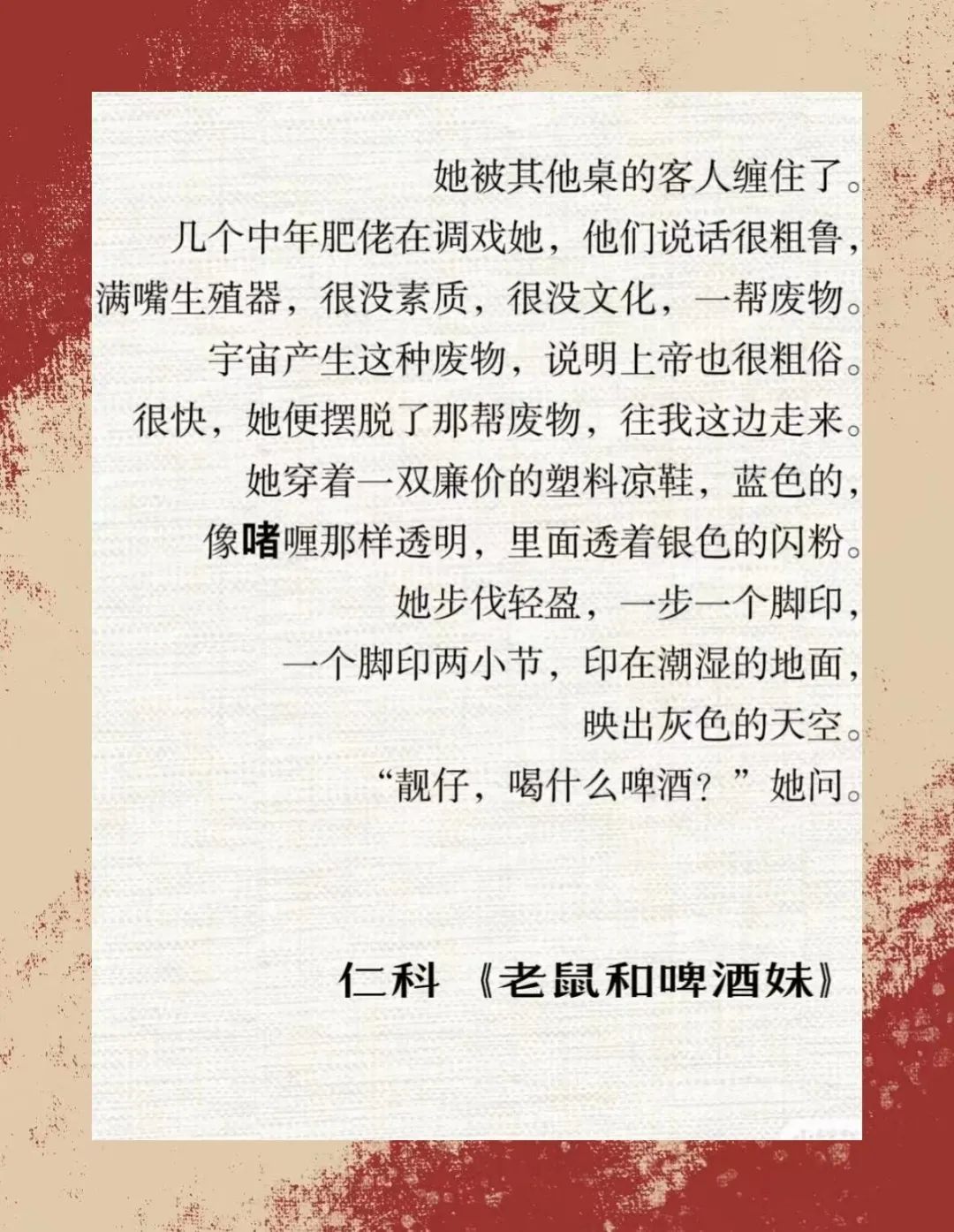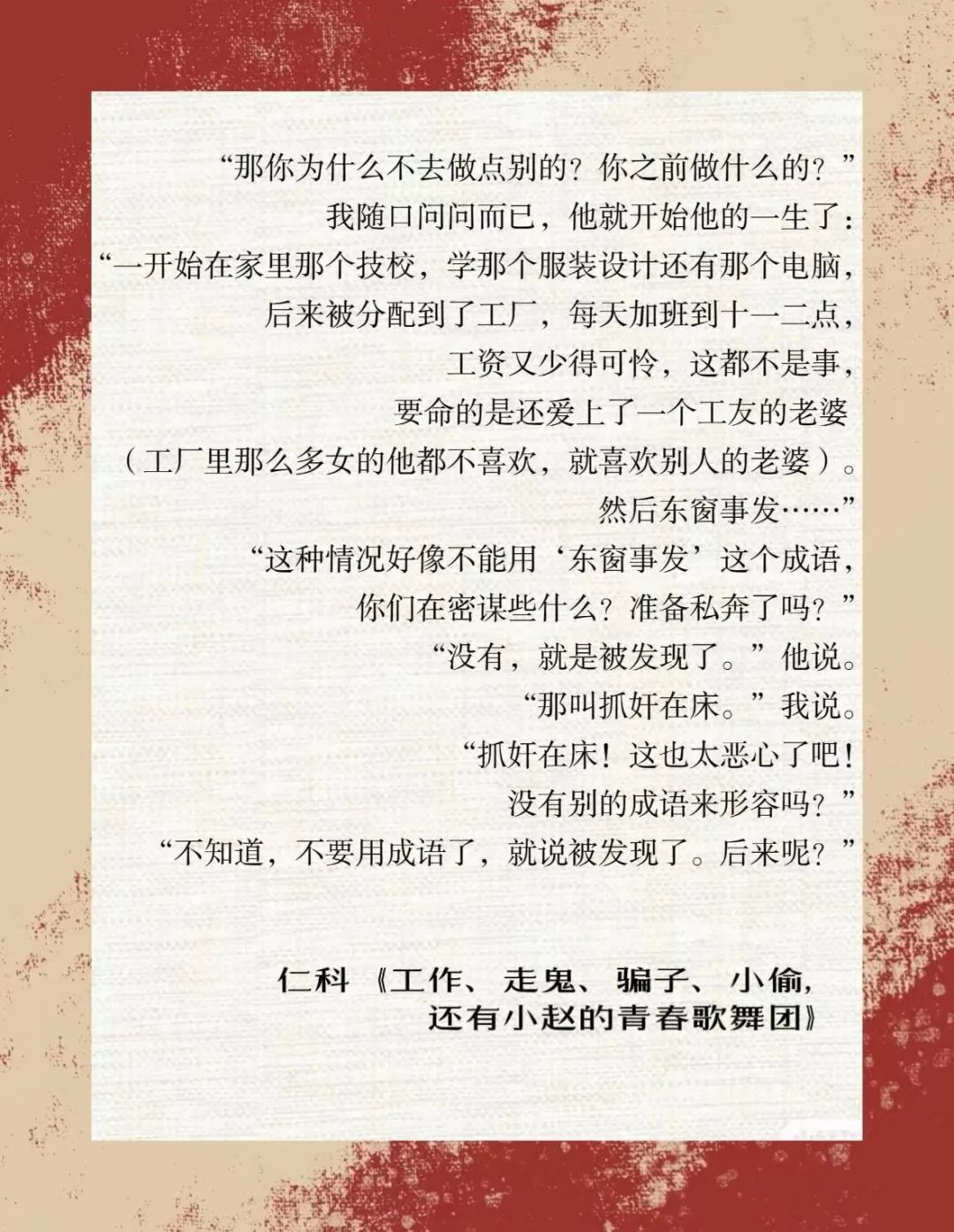 做音乐的仁科说:“宁愿土得掉渣,不愿俗不可耐。”写小说他也是这样。他的作品汲取了很多自己的生活经历——从在小作坊里做学徒到随手搭车告别家乡去往大城市,从走鬼卖盗版书到做歌手四处游荡。小说中的人物,也都是在这些生活里出现的一个个普通人:打工仔、发廊妹、走鬼、骗子、小偷、啤酒妹、流浪歌手……