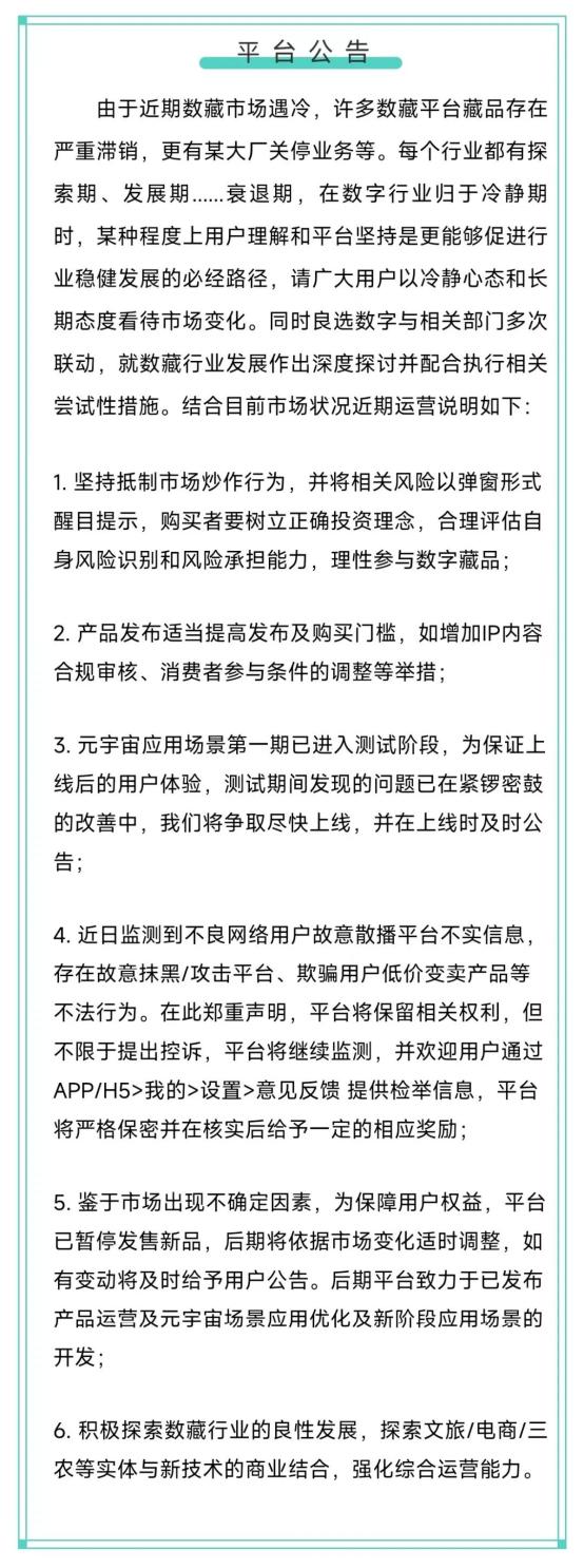 受多方面因素影响以及数藏相关政策和有关部门指导,现在却不得不遗憾的通知您,团队决定即将停止数藏业务,即日起停止数藏服务并开始进行清算工作,同时关闭转赠、流转功能。