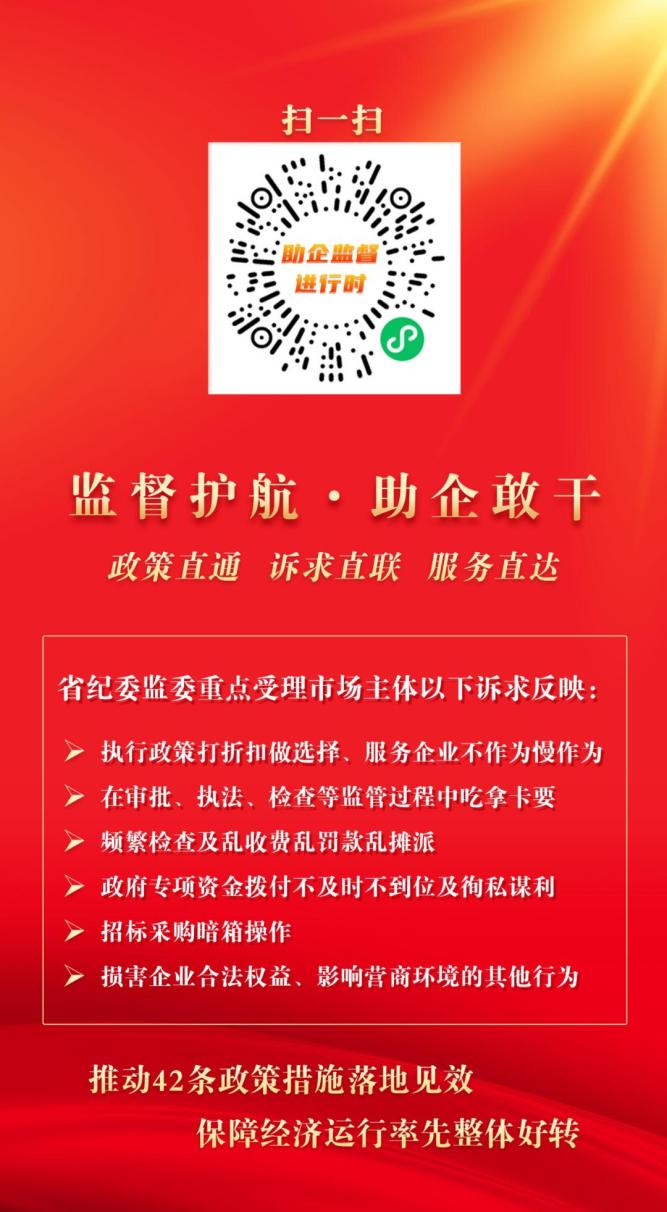 为监督推动中央稳经济一揽子政策和接续措施、江苏出台的42条政策措施落地见效,保障全省经济运行率先整体好转,江苏省纪委监委持续深化服务保障营商环境系列助企活动,会同省政务服务管理办公室近日开通“监督护航·助企敢干”二维码。省纪委监委重点受理市场主体6个方面诉求反映: