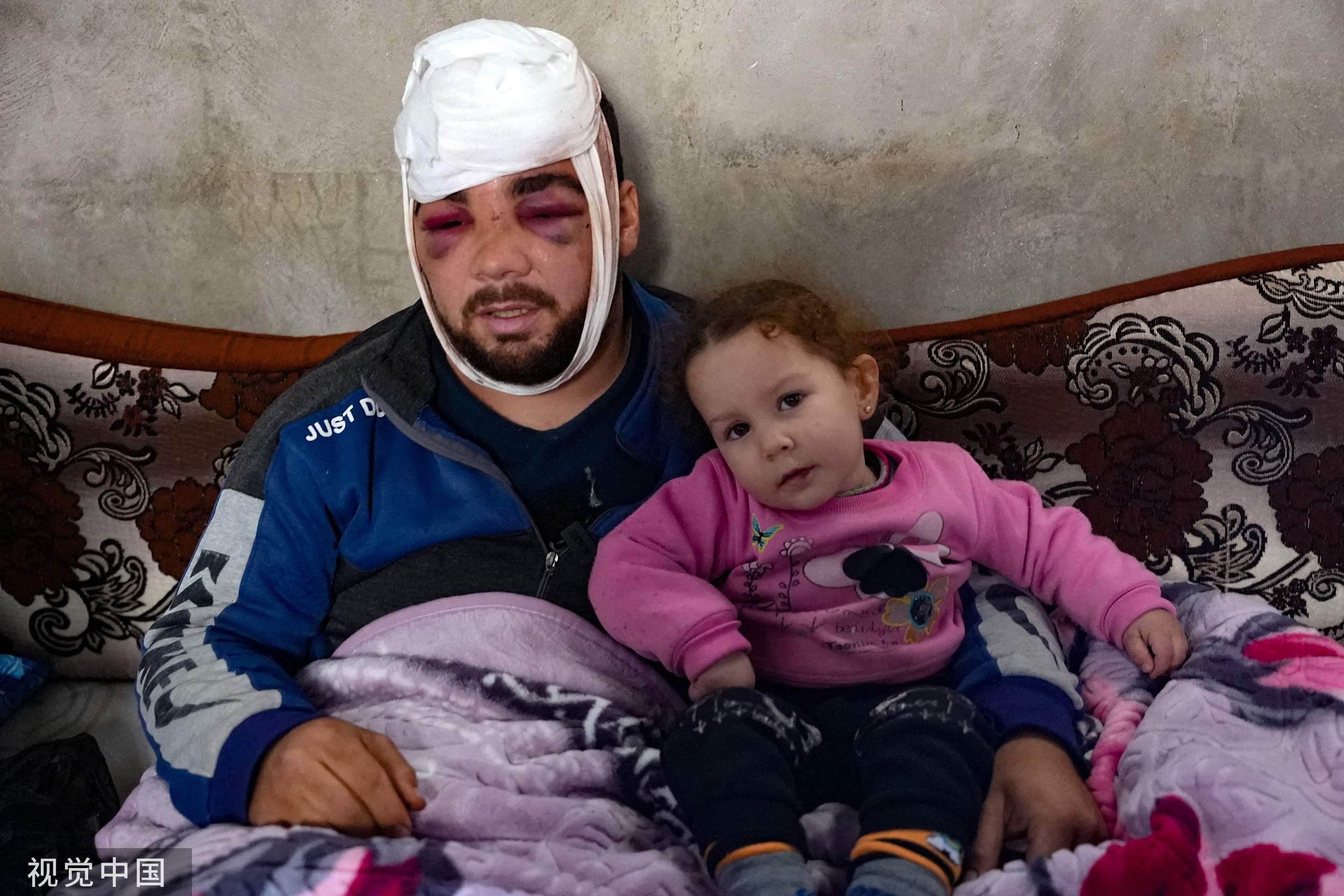当地时间2023年2月8日,叙利亚阿夫林地区,一名在致命地震中受伤的叙利亚男子无家可归,和家人一起坐在难民营的临时避难所。