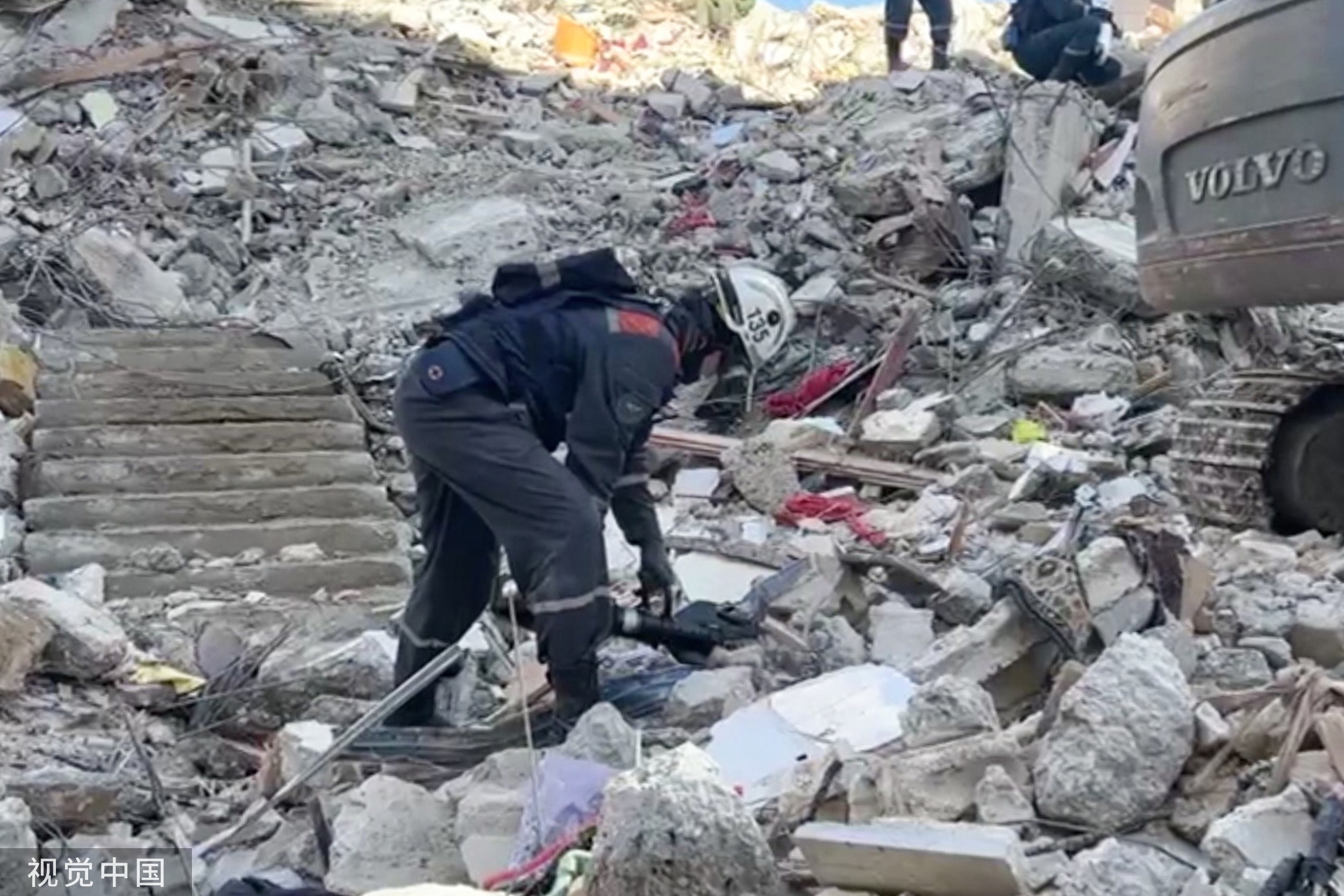 当地时间2023年2月8日,叙利亚,俄罗斯紧急情况部的救援人员在地震后清理废墟。