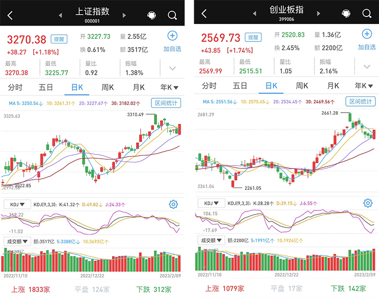 至2月9日收盘,上证综指涨1.18%,报3270.38点;科创50指数涨2.59%,报1036.86点;深证成指涨1.64%,报12048.27点;创业板指涨1.74%,报2569.73点。