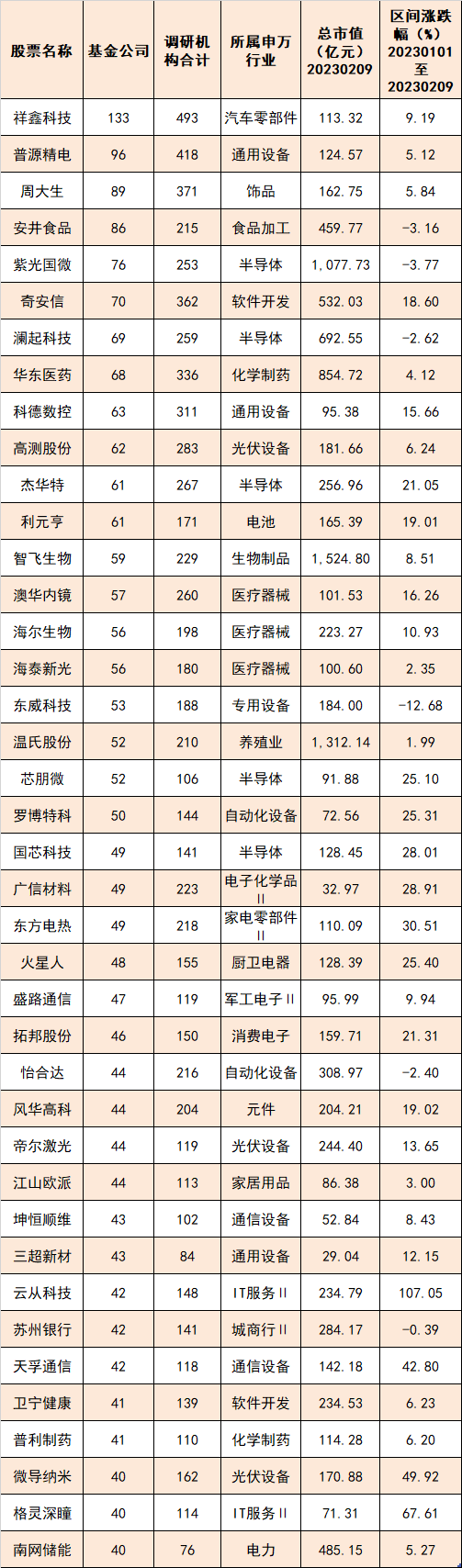 此外,安井食品、紫光国微被超过75家基金公司调研,奇安信、澜起科技、华东医药、科德数控、高测股份等多家公司被超过60家基金公司调研。