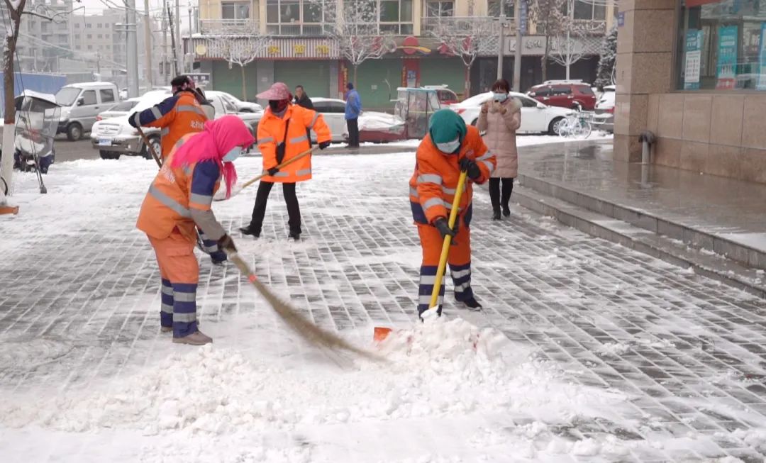 2月8号一大早,临洮县城飘起了鹅毛大雪。因为路面及人行道上有大量积雪,环卫工人高玉萍和工友们提前上工。