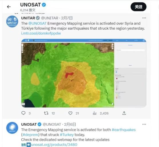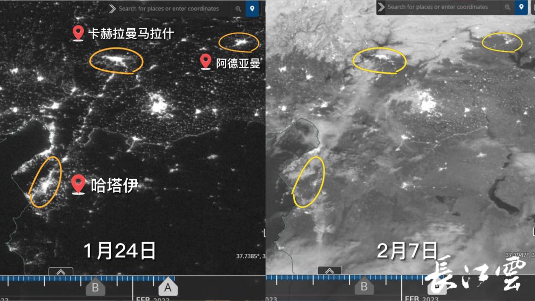 土耳其地震灾区1月24日与2月7日灯光对比。当地时间2月6日,土耳其接连发生两场大地震,震感遍及亚非欧地区。地震发生后,联合国卫星中心宣布激活面向土耳其地震的紧急制图服务。武汉大学测绘遥感信息工程国家重点实验室李熙团队也受邀参与该计划,并作为夜光组召集人,联合国内外团队发起了夜光遥感紧急制图行动。