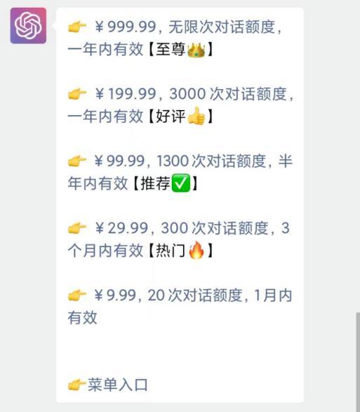 以“ChatGPT在线”为例,它为用户提供4次免费对话额度,之后继续使用需充值,充值额度分别为9.99元/20次(三个月有效)、99.99元/1300次(半年有效)、199.99元/3000次(一年有效)、999.99元/无限次(一年内有效)。