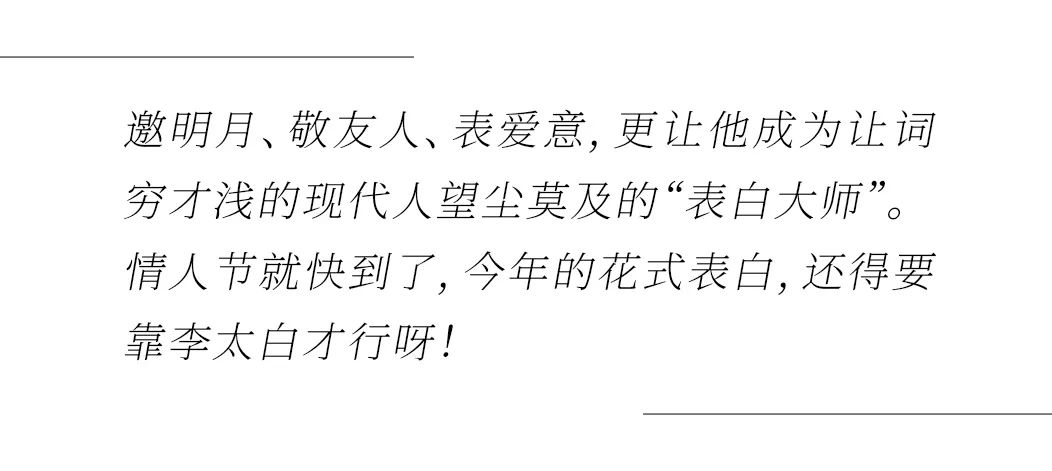 觥筹交错之间,挥就快意人生。那些于微醺之际,或酩酊大醉之时的随性之作,成就了流传千古的浪漫诗歌,邀明月、敬友人、表爱意,更让他成为让词穷才浅的现代人望尘莫及的“表白大师”。今年的花式表白,还得要靠李太白才行呀!