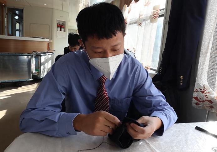 来自新乡桥工段的列车长王喜曾多次参与春运临乘工作。今年春运,王喜依然热情不减,主动加入临乘队伍。刚上车不久,他发现自己衣服袖口的扣子掉了,于是急忙寻找针线包。“我们的仪表、甚至一个细节都代表着铁路形象。虽然我是桥梁工,平时的形象比较粗犷,但做服务工作就必须把最好的一面呈现给旅客。”