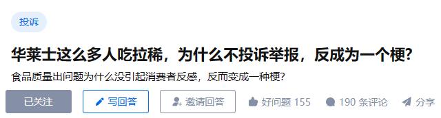 一网友疑惑很多人说华莱士吃了拉稀,但这件事为什么最终成了一个梗?问题上方的分类仅标着“投诉”,暗示这应该是一个严肃的食品安全话题。