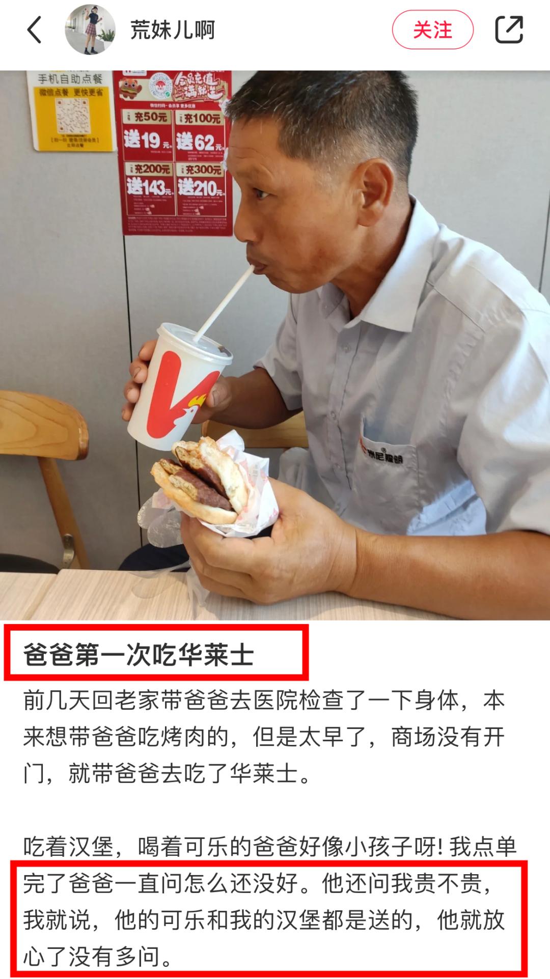 有人记录带爸爸去检查身体时,他第一次吃到华莱士,爸爸会先问这个贵不贵,听到可乐和汉堡都是送的,才放心地一手一个拿了起来。