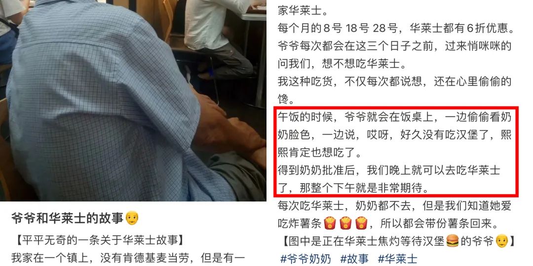 ·来自@荒妹儿啊还有网友写了爷爷和华莱士的故事,她说在每个月打折的那几天,爷爷都会在饭桌上做舆论动员,像对暗号一般等待着奶奶的批准,然后开心地带娃儿去吃华莱士。
