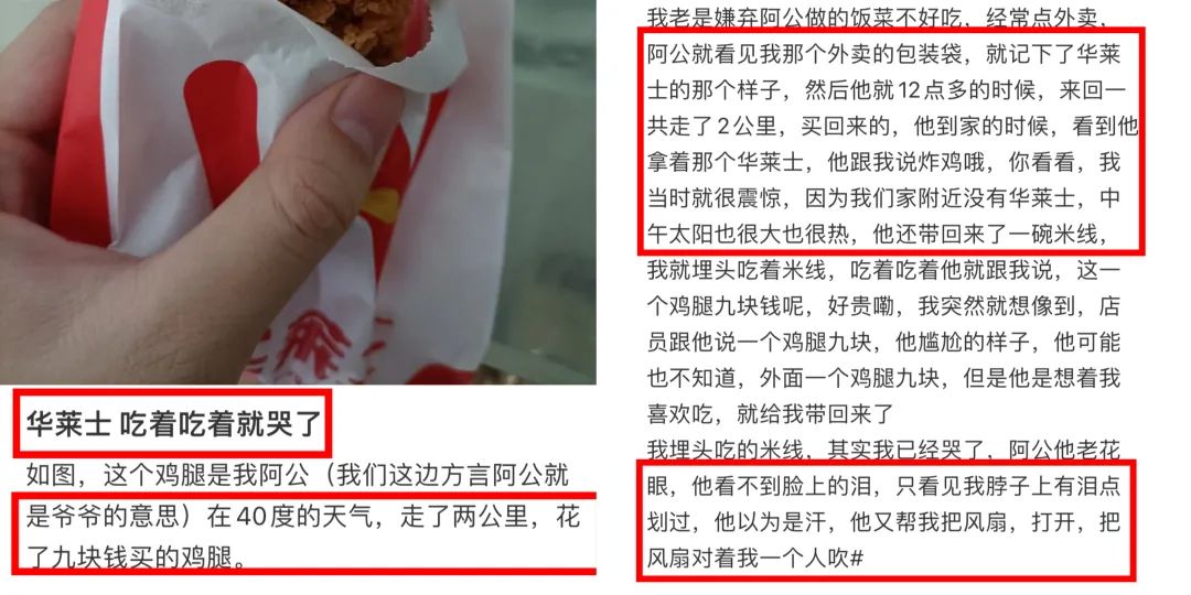 不是天下所有的爷爷都认得华莱士,但仍会有阿公仅凭着孙女外卖包装袋上的样子,就能在40度的天气下步行两公里给她买到炸鸡。