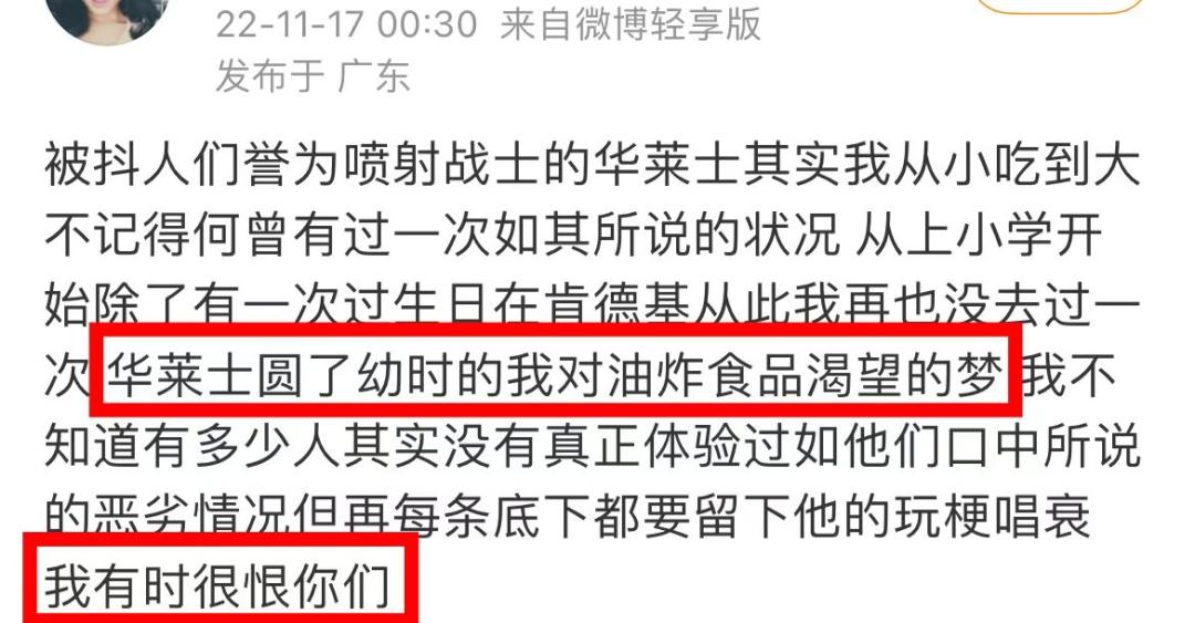 有网友说,华莱士圆了幼时的她对油炸食品渴望的梦,这甚至引起了她现在对喷射梗的恨。