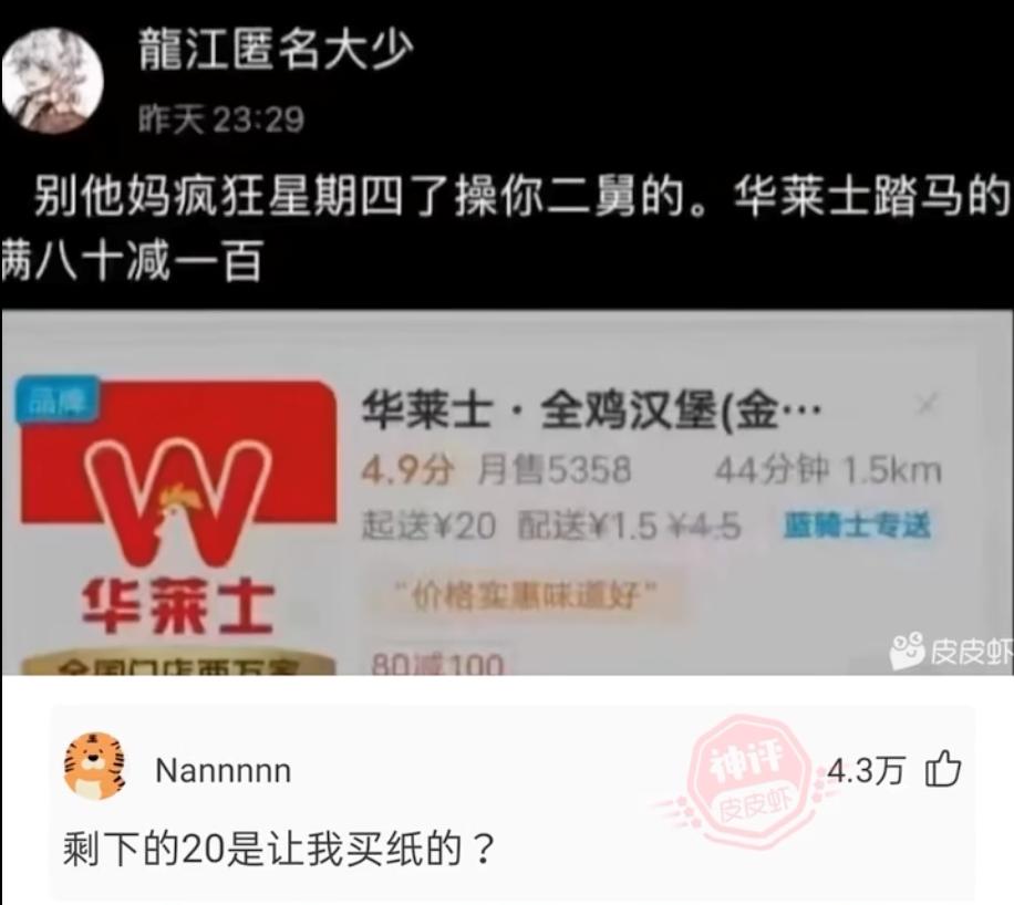有人在疯狂星期四文案下调侃,华莱士100-80的差价是不是用来买纸?