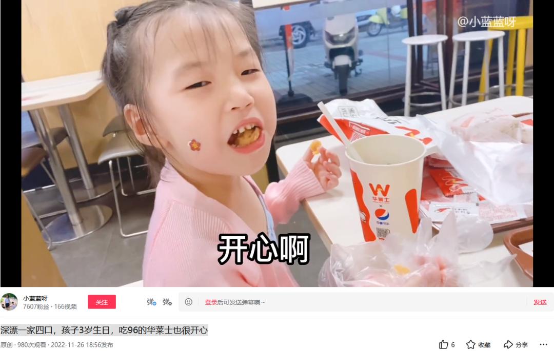 那天我刷到了深漂的一家四口,在孩子3岁生日那天他们去吃了96元的华莱士套餐。