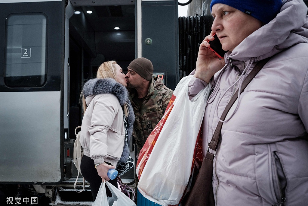 当地时间2023年2月12日,顿涅茨克地区克拉马托尔斯克,火车站里,43岁的乌克兰军人在与家人分离三个多月后亲吻妻子。视觉中国 图