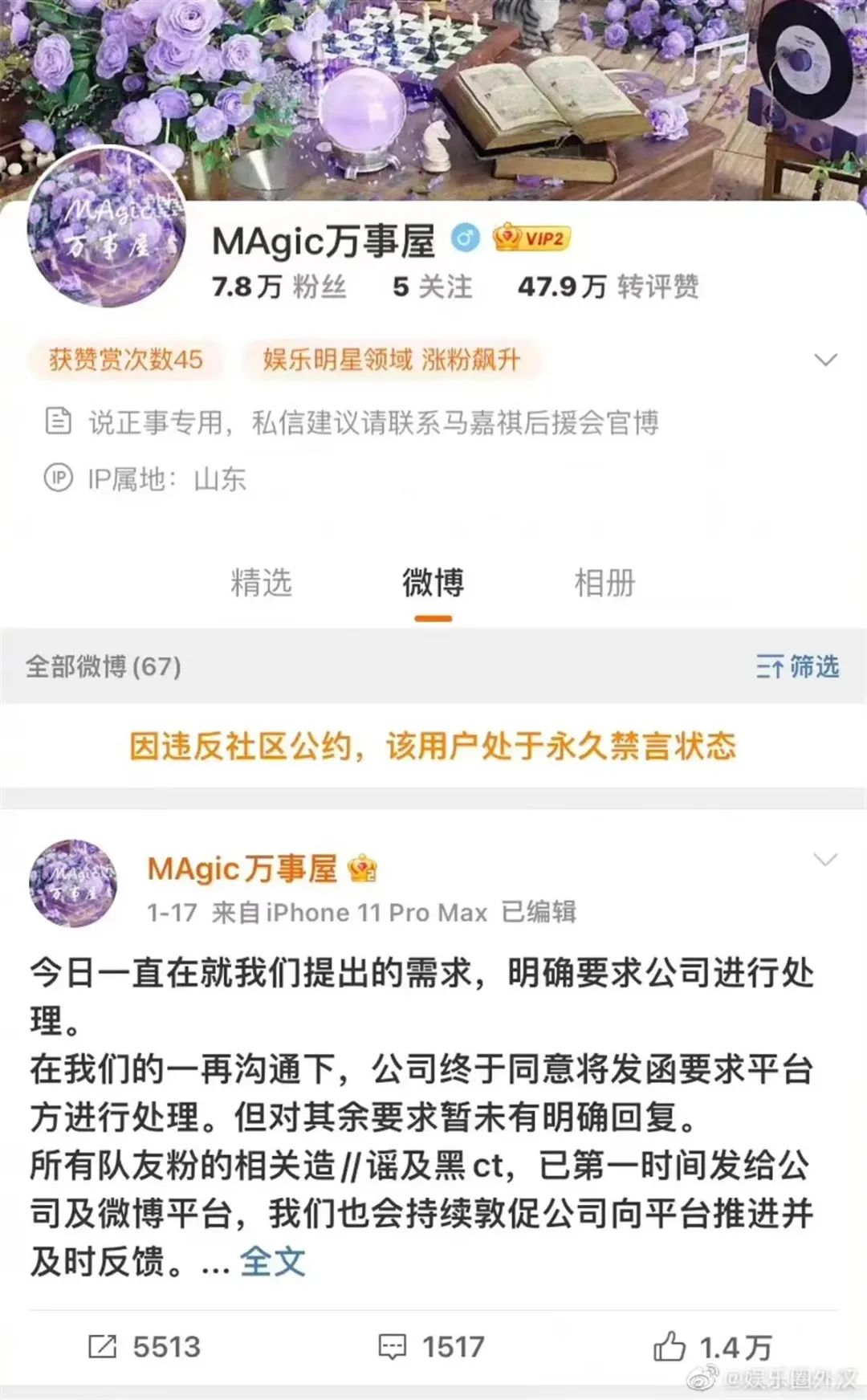 账号被微博永久禁言。