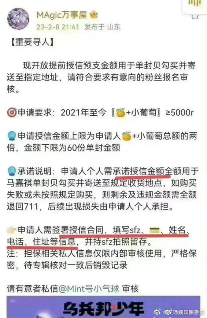 来源:马嘉祺个人微博网友给出的截图显示,2月8日21:41,“MAgic万事屋”就时代少年团即将发布的第二张专辑《乌托邦少年》进行购买准备,消息中提到“集资”(用橘子图片作为暗号代替)。文中更给出了疑似借贷路径,要求申请人“签署授信合同,填写身份证,银行卡,姓名,电话,住址等信息,并持身份证拍照留存”,同时表示“专辑核对一致后销毁记录”。