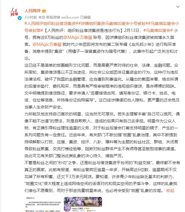 2月13日,人民网评发表评论文章《组织粉丝借贷集资是违法行为》。