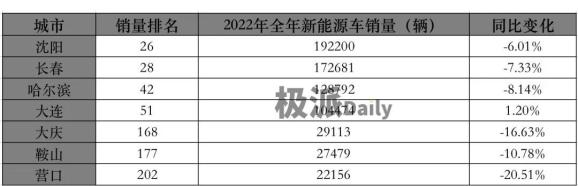 比起不如人意的销量,更坏的消息是,几大东北城市2022年新能源车销量几乎都在同比下滑。而大庆、鞍山、营口这样的四线城市更是同比下滑了10-20%。