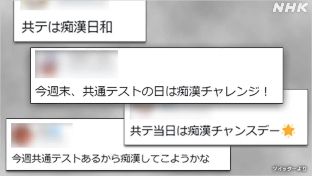 这两年,每到1月中旬的考试季,日本警方就会加大对电车性犯罪的警戒力度,各大媒体也会反复宣传“提防电车痴汉”。但在共通考试期间,你还是偶尔能在推特上看到有关“痴汉祭”的色情宣言,以及被性骚扰者所发出的控诉。