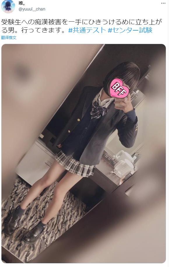今年共通考试日,就有一位大和男儿,为了“替被性骚扰的女孩分担”而着女装出门,踏上了高峰时段的通勤电车。