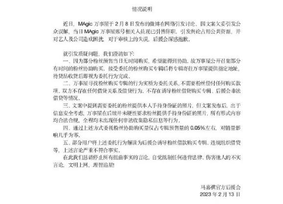 2月13日晚9时许,马嘉祺后援会发布情况说明:因文案欠妥引发公众误解,当日MAgic万事屋账号相关人员现已引咎辞职。