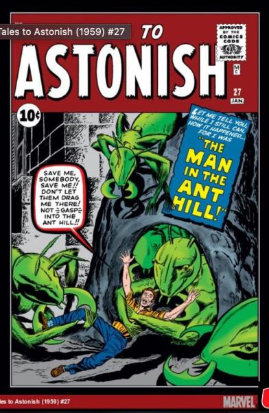 蚁人首次登场的封面2⃣️ 是亨利·皮姆发现了一组亚原子粒子并命名为“皮姆粒子”。他将它们分离成一种血清,让他能缩小到一只蚂蚁的大小(第二种血清使他恢复到正常大小)。并且在再次调整血清后,他还可以变成巨人那般大,只是在电影《蚁人》中,斯科特·朗尚未拥有变大的技能。