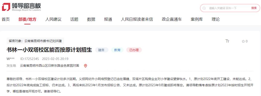 人民网“地方领导留言板”截图该回复表示,经调查,昆明市西山区龙江公园旁双塔片区新配建小学(书林一小双塔校区)建设项目目前尚未建设完成,预计在2023年4月开工建设,在科学合理安排工期的前提下,将力争早日投入使用。按照目前的进度,2023年9月无法投入使用。