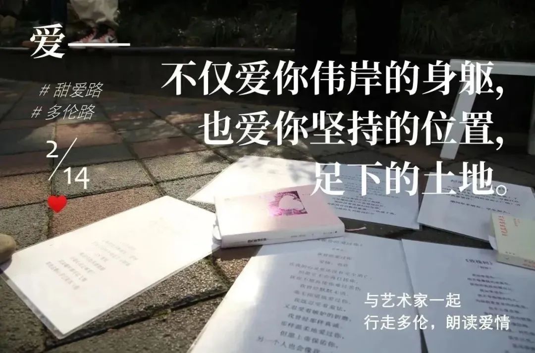 2月14日,艺术家、读诗人曹再飞来到甜爱路和多伦路,在爱情出现的地方,用声音描摹出理想中的爱情。伫立、行走、朗读,以一句句浪漫的诗句做成花,束起送给情人们的芬芳。