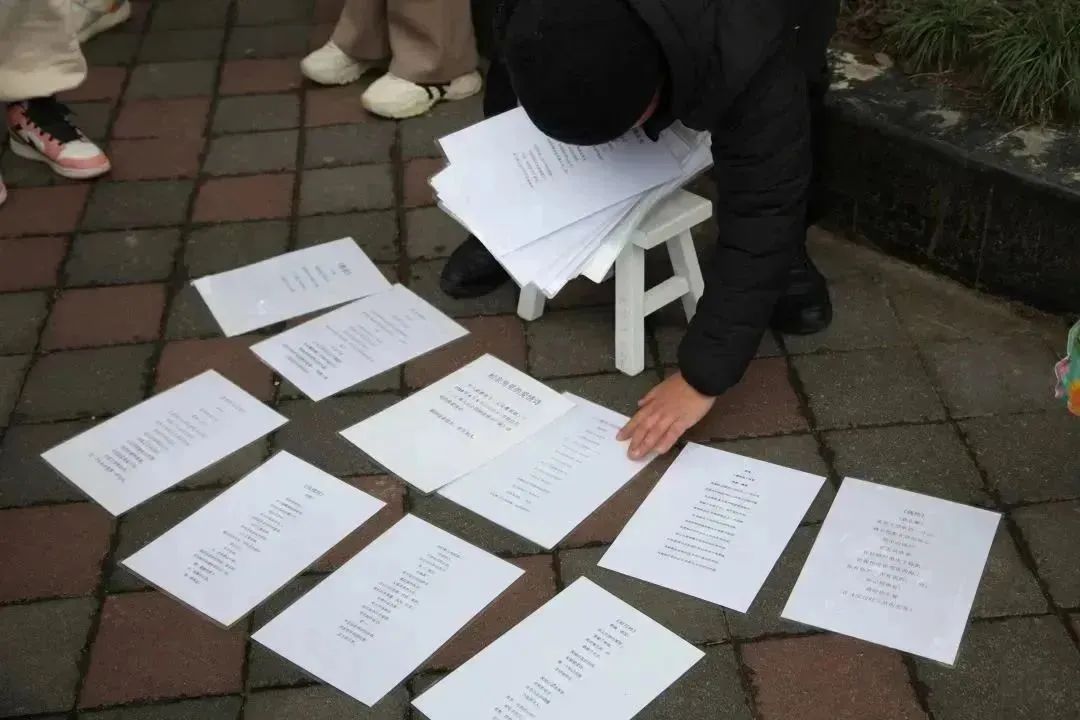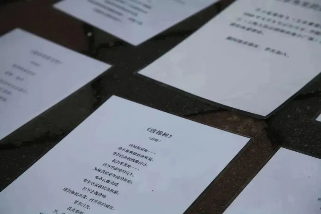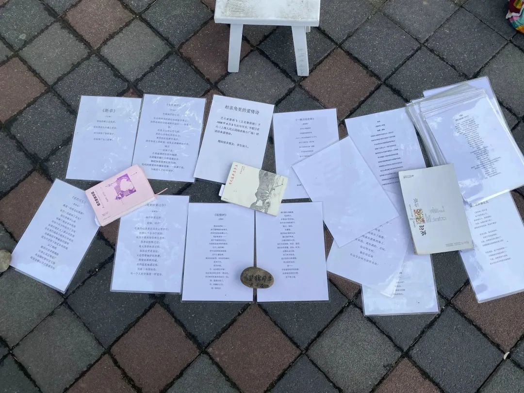 曹再飞将诗歌打印在A4纸上,塑封,摆放在他的小板凳前