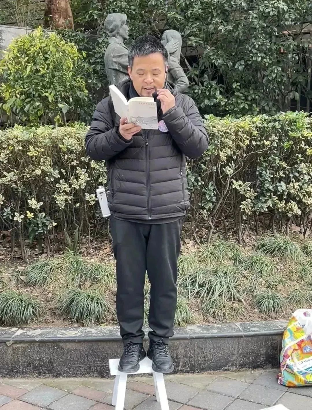 每个周末和节假日他独自带着一张小板凳,斜跨小蜜蜂扩音器,高站在爱情本该出现的地方,大声朗读爱情诗。