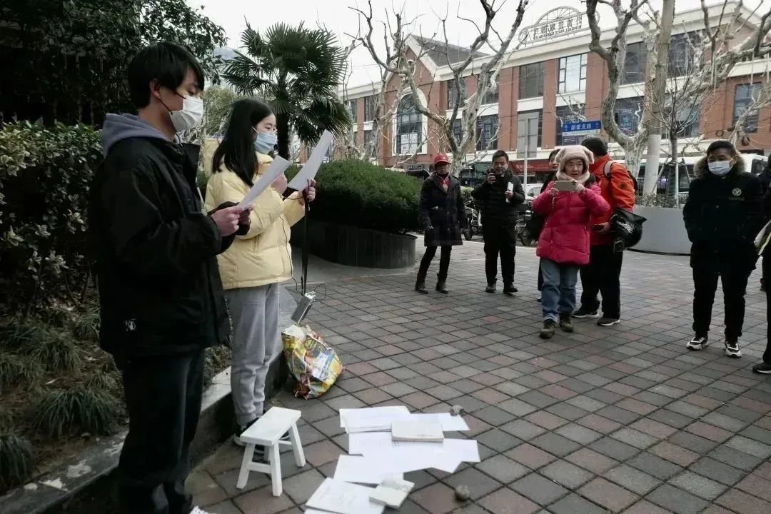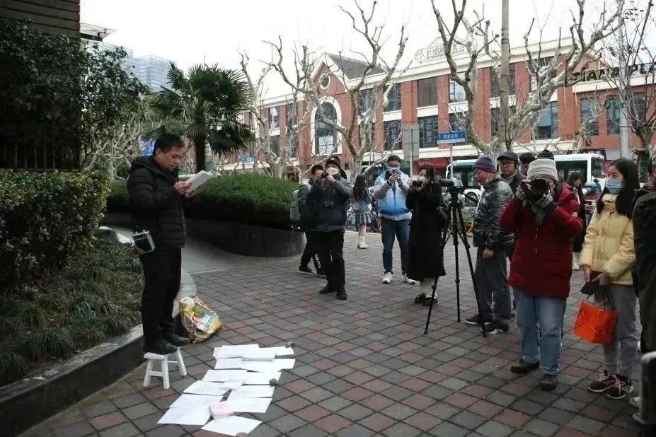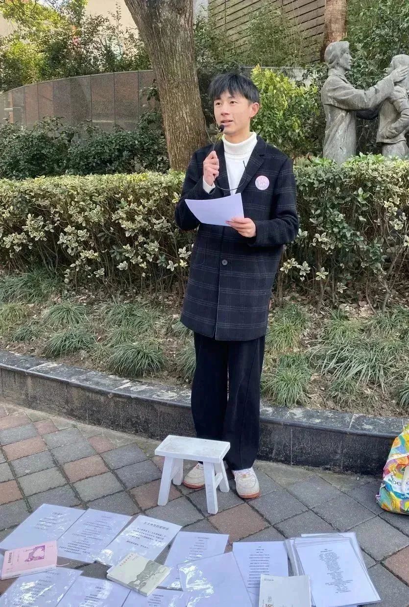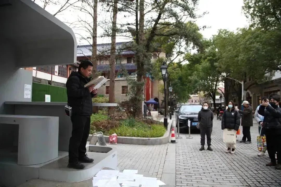 2月14日,虹口区新时代文明实践中心、虹口区新时代文明实践志愿服务总队联合上海多伦现代美术馆组织开展“与艺术家一起行走多伦,朗读爱情”志愿活动,曹再飞带着爱情诗歌来到甜爱路和多伦路,边行走边朗读,践行一场冬日的浪漫。
