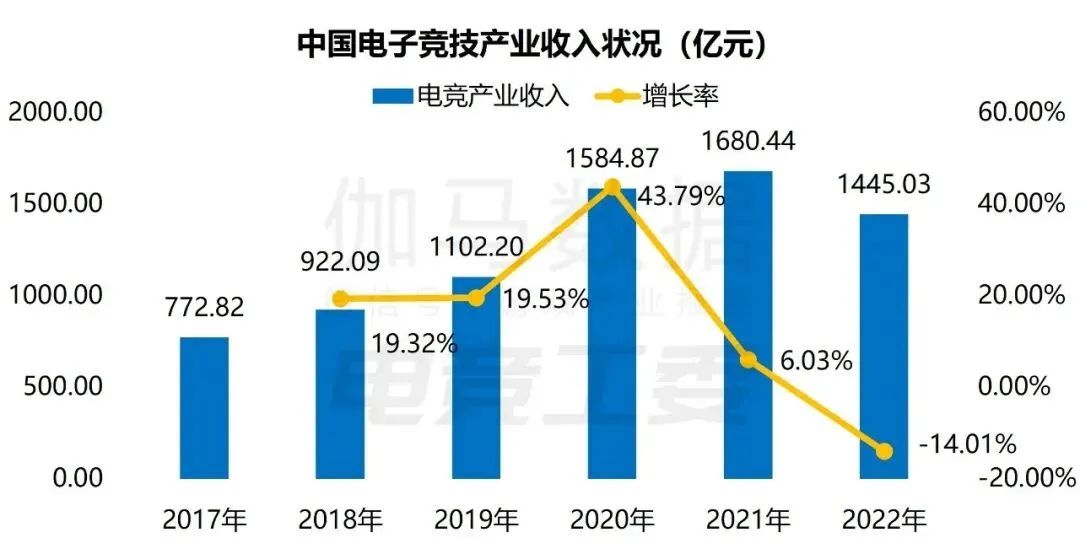 2月17日,《2022年中国电子竞技产业报告》在首届电竞产业年会上发布。报告显示,2022年我国电竞产业收入1445.03亿元,同比下降14.01%,为五年来首次下降;2022年电竞用户规模约4.88亿,同比下降0.33%。