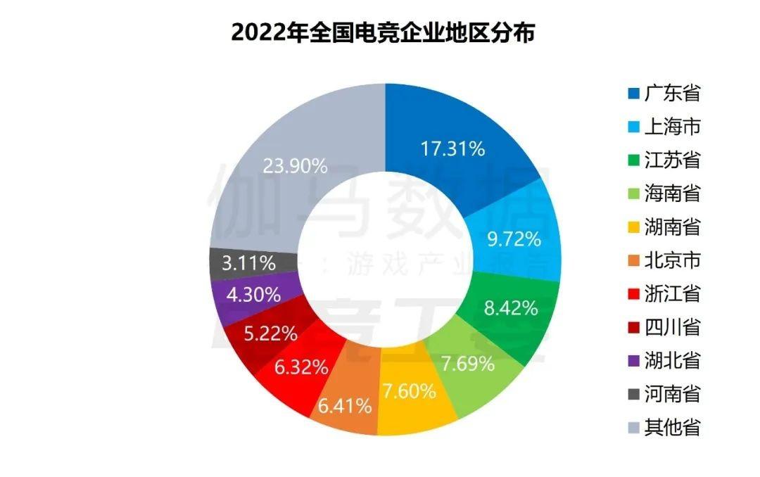 2022年,中国电子竞技企业在全国的分布情况是,广东省、上海市、江苏省、海南省、湖南省、北京市、浙江省、四川省的电子竞技企业数量较多,占比均高于5%。其中,广东省电子竞技企业数量占比为17.31%,上海电子竞技企业数量占9.72%,江苏电子竞技企业数量占8.42%,是电子竞技企业数量最多的三个地区。