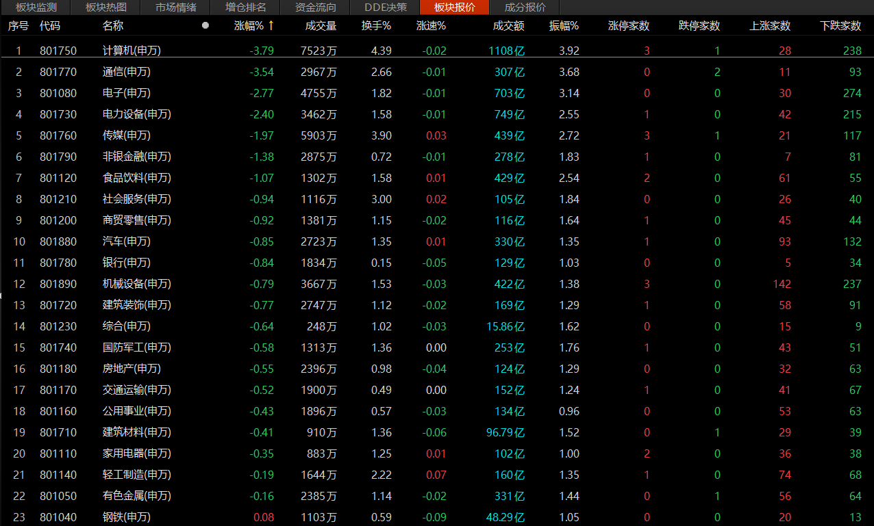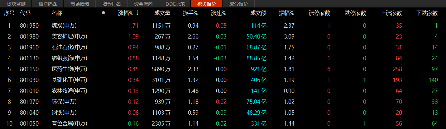 盘面上,31个申万一级行业中仅9个行业板块收涨,其余22个行业板块收跌。其中,煤炭、美容护理、石油石化、纺织服饰、医药生物、基础化工等板块涨幅居前。下跌方面,计算机、通信、电子、电力设备、传媒等行业板块跌幅居前。