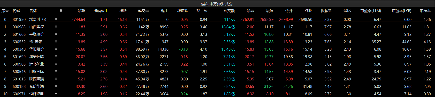 煤炭板块以1.71%的涨幅领涨,山西焦煤大涨5.91%,平煤股份、*ST未来、华阳股份、潞安环能、淮北矿业、山煤国际跟涨,涨幅均超3%。