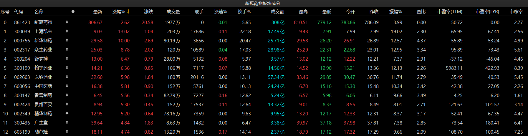 概念股方面,今日新冠药物概念板块表现强势,板块整体收涨2.62%。个股方面,上海凯宝大涨13.02%,新华制药涨停,众生药业涨超8%,舒泰神、翰宇药业、以岭药业、中国医药、香雪制药、贵州百灵、精华制药涨超5%。