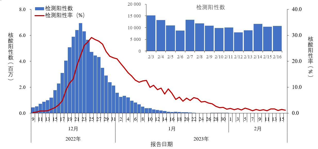 2022年12月9日以来,各省份报告人群核酸检测阳性数及阳性率呈现先增加后降低趋势,阳性人数12月22日达到高峰(694万)后波动下降,2月16日为10720例;检测阳性率12月25日达高峰(29.2%)后波动下降,2月16日为1.1%(图1-1)。