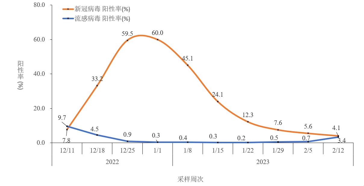 2022年第49周(12月9日),流感样病例新冠病毒阳性率开始逐渐增加,在第51和52周期间达峰值后持续下降,2023年第6周(2月6-12日)新冠病毒阳性率已下降至4.1%。2022年第49周以来,流感病毒阳性率则逐步降低,12月下旬至2月初处于极低水平(低于1.0%);2023年第6周,流感病毒阳性率有所上升(3.4%)(图2-5)。