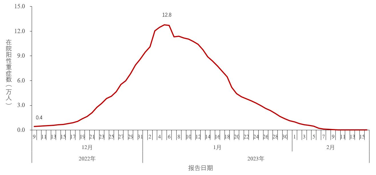 (二)在院新冠病毒感染阳性重症患者结果。全国在院新冠病毒感染者中,重症患者数量于2022年12月27日至2023年1月3日期间每日增量近1万,1月4日增量明显下降,1月5日达到峰值12.8万后持续下降,2月16日下降至56例(其中新冠病毒感染重症6例、基础性疾病重症合并新冠病毒感染50例),较峰值下降了99.9%(图3-2)。
