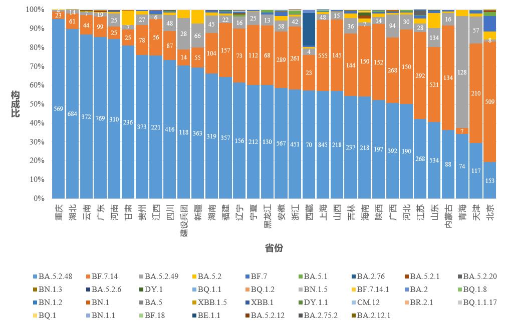 (三)新冠病毒变异分省份情况。总体来看,北京、天津和内蒙古以BF.7及其子分支为优势株;江苏BF.7及其子分支和BA.5.2及其子分支基本持平;其他省份均以BA.5.2及其子分支为优势株(图4-2)。
