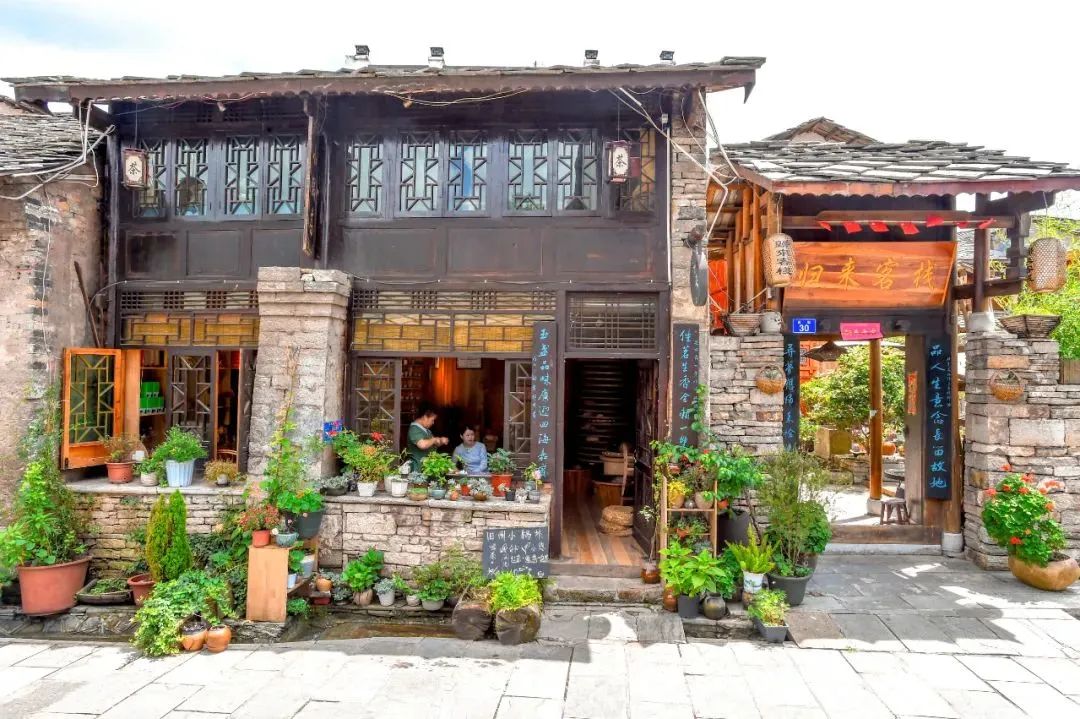 街道上随处可见的木质房屋、层叠错落的石院墙、青翠欲滴的植物,构成了旧州古色古香的建筑风格。