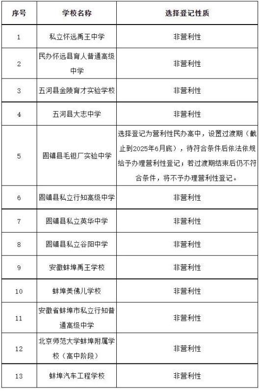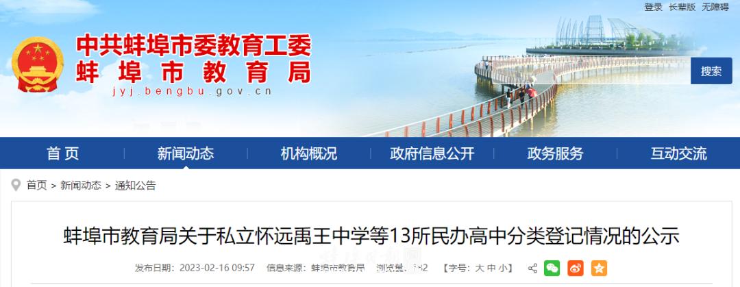 蚌埠市教育局关于私立怀远禹王中学等13所民办高中分类登记情况的公示