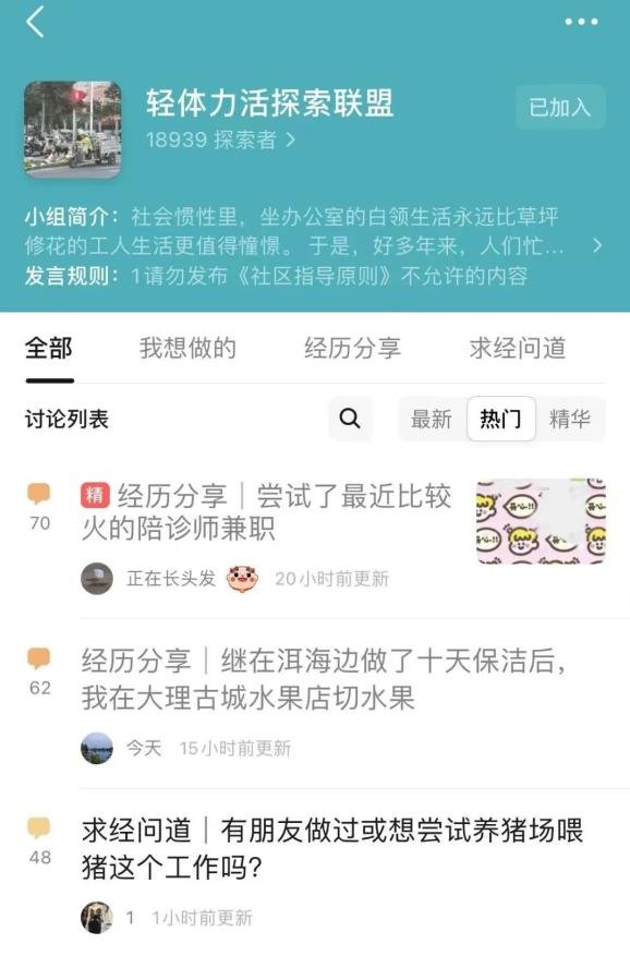 久期本来以为只有少部分人会这样想,但随着组员人数增加,她发现“辞职尝试轻体力劳动”可能会成为年轻人的生活新趋势。
