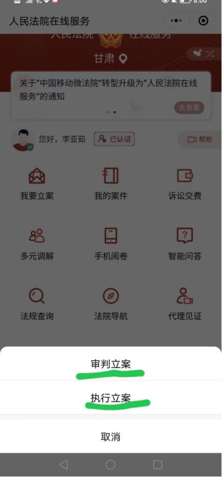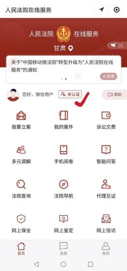 NO.2第二步:在“人民法院在线服务甘肃”的首页中,首先点击未认证,填写身份证号及姓名等信息后,进行人脸识别认证;认证结束后,再次回到“人民法院在线服务甘肃”的首页,点击我要立案进行立案申请。