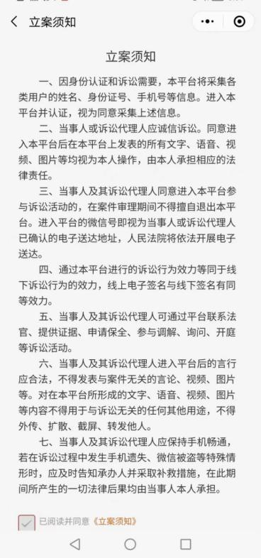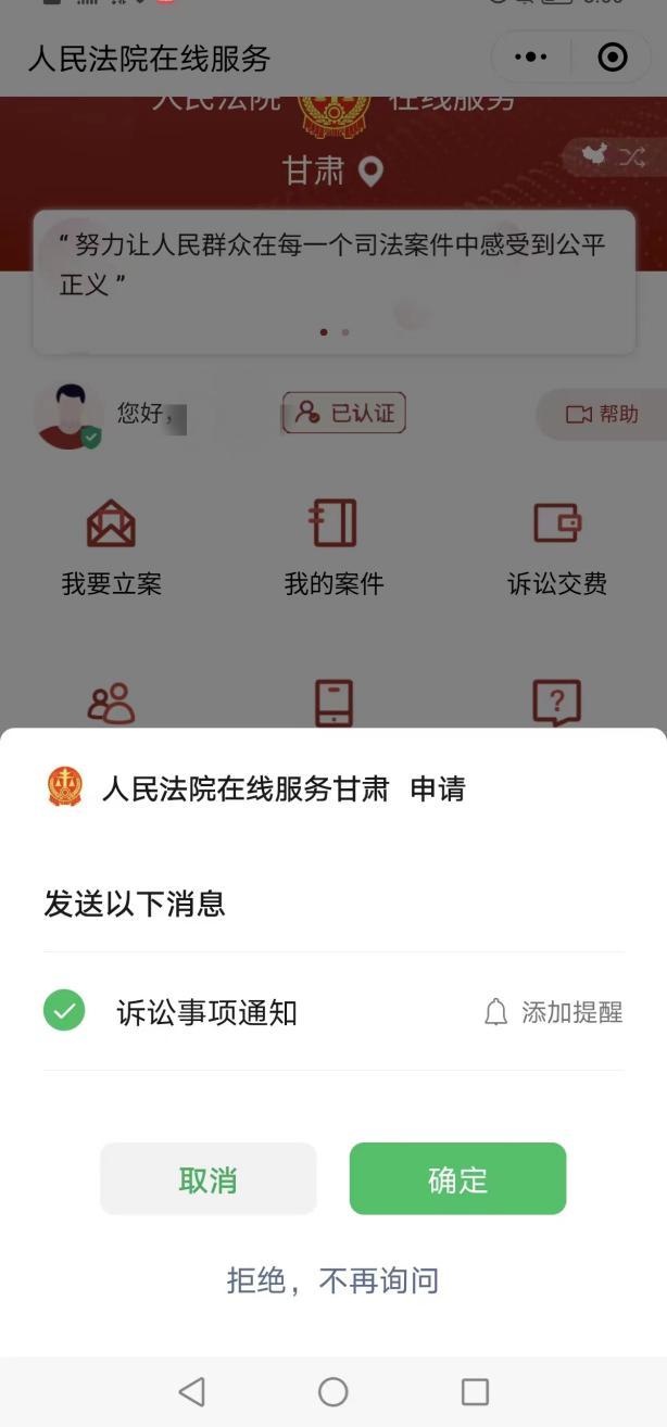 NO.3第三步:点击我要立案后,会出现是否接收诉讼事项通知的页面,点击允许后,进入下一步的操作。