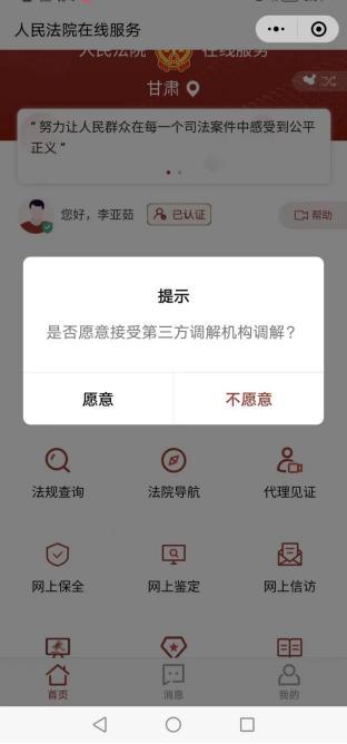 NO.5第五步:选择审判立案后,会提示您是否愿意接受第三方调解机构调解,(如争议不大,您可选择愿意调解,由专业的调解员对您的案件进行诉前调解),如要直接立案,请选择不愿意,进入法院的立案程序。
