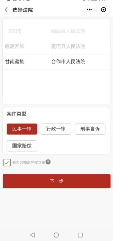 NO.7第七步:选择镇原县人民法院,并选择相应的案件类型进行立案,这里以民事一审案件为例进行操作。